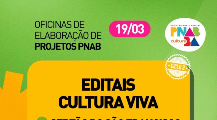 No dia 19 de março, das 16h às 18h, será realizada uma Oficina sobre os Editais Cultura Viva, um momento de orientação e esclarecimento de dúvidas sobre os novos editais lançados pela Secretaria de Cultura do Estado da Bahia, dentro da Política Nacional Aldir Blanc (PNAB).
