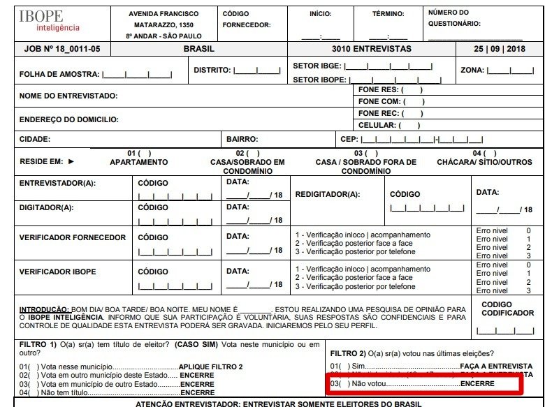 Desta vez não foi entrevistado quem não votou nas últimas eleições. Em nota, o instituto afirma “que não há qualquer alteração”. “As pesquisas eleitorais realizadas para a TV Globo e O Estado de S. Paulo, desde 2014, consideram eleitores votantes, levando em conta a média histórica das abstenções. As pesquisas realizadas para a Confederação Nacional da Indústria (CNI), como a divulgada no dia 26 de setembro, historicamente são realizadas com eleitores. Ambas representam o eleitorado brasileiro e seus resultados foram comparados, pois os dados são consistentes e não há diferenças significativas entre eles”, diz em nota.