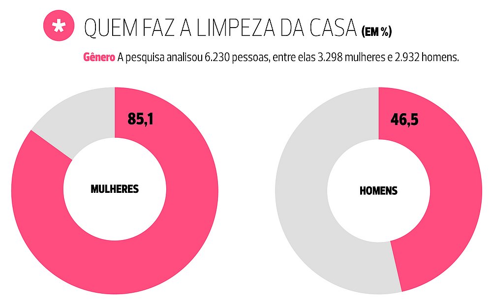 Um aspecto que também chamou a atenção na pesquisa foi o baixo número de homens trabalhando com limpeza: apenas 57. “Preciso ser honesto: a maioria dos meus amigos é mal acostumada porque, provavelmente, na casa deles viveram em condições parecidas com a minha: alguém que fizesse a faxina. Geralmente uma mulher. Então eles ficavam mal acostumados”, revela o geólogo Lucas Blanes, 29.