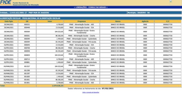 Em pesquisa realizada no site do Fundo Nacional de Desenvolvimento da Educação – FNDE, o Preto no Branco verificou que a Secretaria Municipal de Educação de Juazeiro já recebeu, nestes três primeiros meses de 2021, o valor de R$ 1.079.638,20 para o suporte alimentar dos alunos da rede pública. Porém, até o momento, a Prefeitura não noticiou nenhum plano de distribuição dos kits.