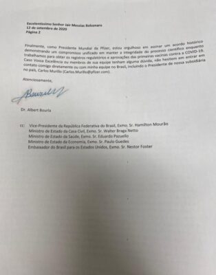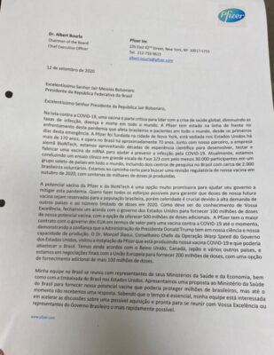 “A potencial vacina da Pfizer e da BioNTech é uma opção muito promissora para ajudar seu governo a mitigar esta pandemia. Quero fazer todos os esforços possíveis para garantir que doses de nossa futura vacina sejam reservadas para a população brasileira, porém celeridade é crucial devido à alta demanda de outros países e ao número limitado de doses em 2020”, disse a carta.