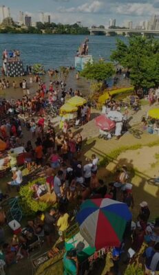 Uma multidão tomou conta de toda a extensão da orla fluvial, ocupando a parte de cima, as margens, na sombra, no sol. Parecia que todos tinham combinado ir a orla na mesma hora. Engarrafamento, vai e vem de pessoas, aglomeração.