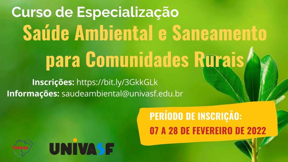 A Especialização em Saúde Ambiental e Saneamento para Comunidades Rurais teve as inscrições prorrogadas até o dia 15 de março. O curso é fruto de uma parceria entre a Universidade Federal do Vale do São Francisco (Univasf) e a Fundação Nacional de Saúde (Funasa).
