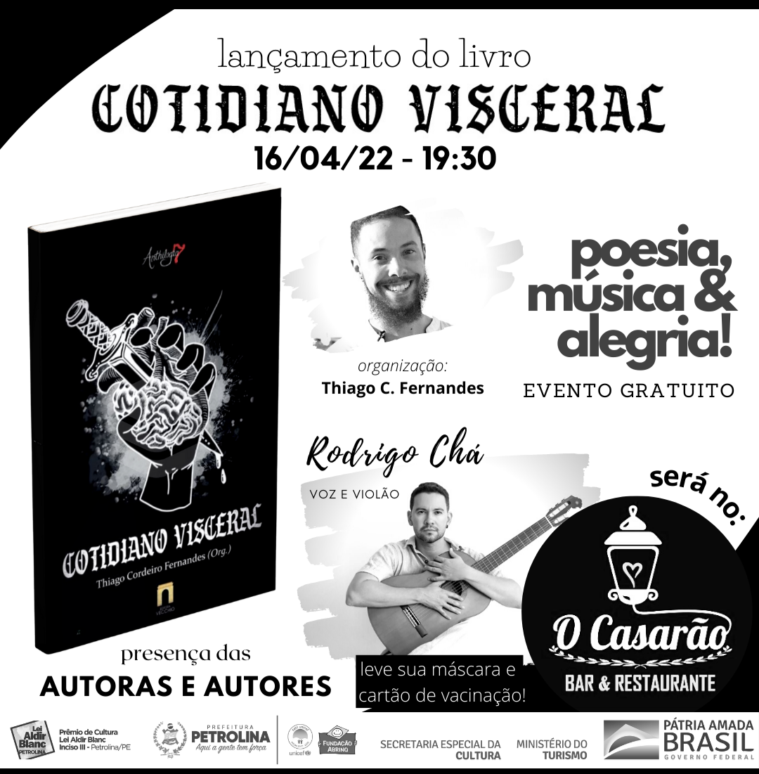 “Propomos neste livro um rasgo poético, para atravessar as veredas da ponte Pernambuco-Bahia. Nessa obra, somos dezessete poetas discorrendo sobre nossas inquietações e devaneios literais. Expondo as vísceras íntimas do nosso cotidiano, versando sobre o que sentimos e sobre o que pensamos. Diversificados em seus estilos de escrita e de diferentes inspirações. O ponto em comum entre os autores é o atravessamento poético que nos corta, nos aflige e nos inspira em saudável rebeldia e que escorre pelos dedos através das nossas conexões nervosas. Esse “atravessamento” é o título da obra, o Cotidiano Visceral que vocês vão ler nas concepções dos participantes deste projeto. Então, fica o convite à leitura e ao deleite dessa obra coletiva que chega no Vale do São Francisco para agitar a cena poética ribeirinha”, convidou Thiago C. Fernandes.