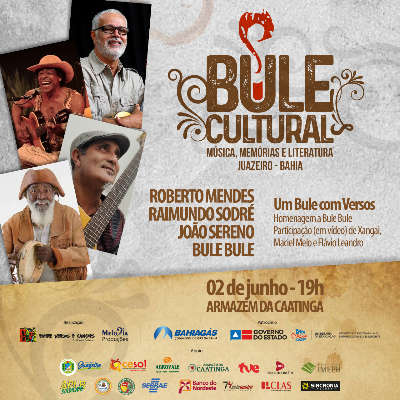Um encontro musical recheado de memórias e literatura, reúne no próximo dia 2 de junho, às 19h, no Galpão do Armazém da Caatinga, orla de Juazeiro – BA, os cantores e compositores Raimundo Sodré, Roberto Mendes e João Sereno. As atrações fazem parte do projeto Bule Cultural que foi aberto no último dia 18, com oficina de cordel e show, e deve movimentar o Vale do São Francisco até o dia 5, com uma programação gratuita que inclui oficinas literárias, saraus poéticos, lançamentos de livros, cantorias, glosas e shows.