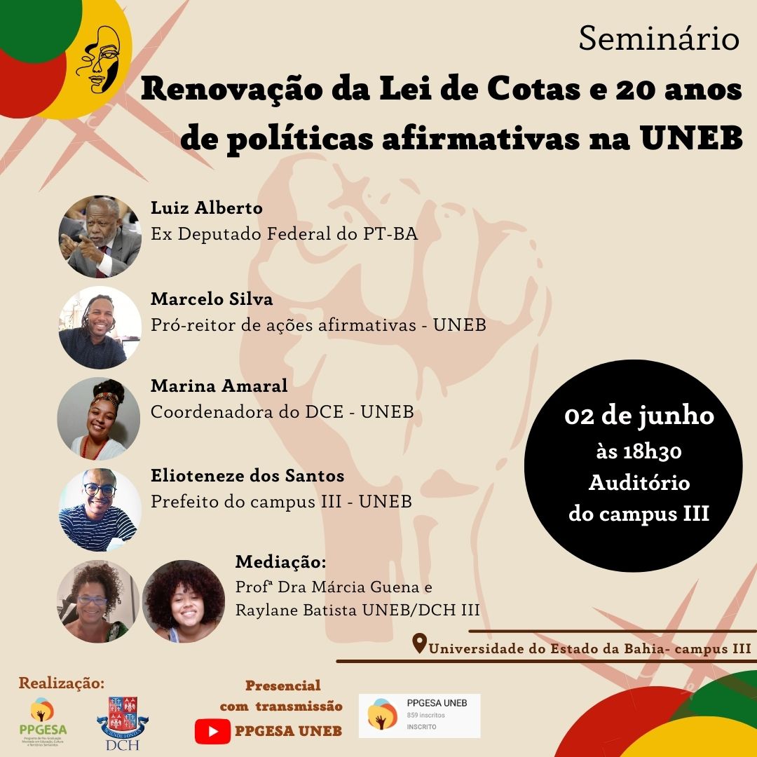 O evento faz alusão ao processo de renovação da Lei nº 12.711/2012, conhecida como Lei de Cotas, organizado pela disciplina Fronteiras Interdisciplinares em Educação e Comunicação, ministrada pelos docentes Prof. Dr. Nicola Andrian e a Prof.ª Dra. Márcia Guena, vinculada ao Programa de Pós-Graduação em Educação, Cultura e Territórios Semiáridos (PPGESA) da UNEB.
