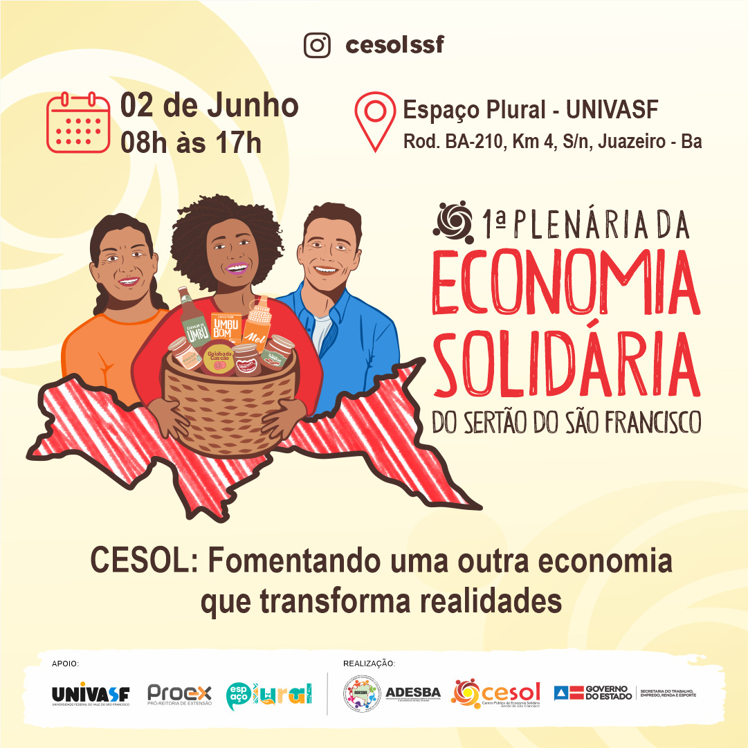 O Centro Público de Economia Solidária Sertão do São Francisco (CESOL-SSF), realizará no dia 02 de junho, a primeira Plenária de Economia Solidária. O evento acontecerá no Espaço Plural da Universidade Federal do Vale do São Francisco (UNIVASF), em Juazeiro, a partir das 08h, e será direcionado para os empreendimentos solidários do território.