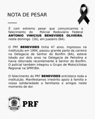 De acordo com a PRF, o falecimento de Benevides “entristece toda a instituição”. Veja a nota: