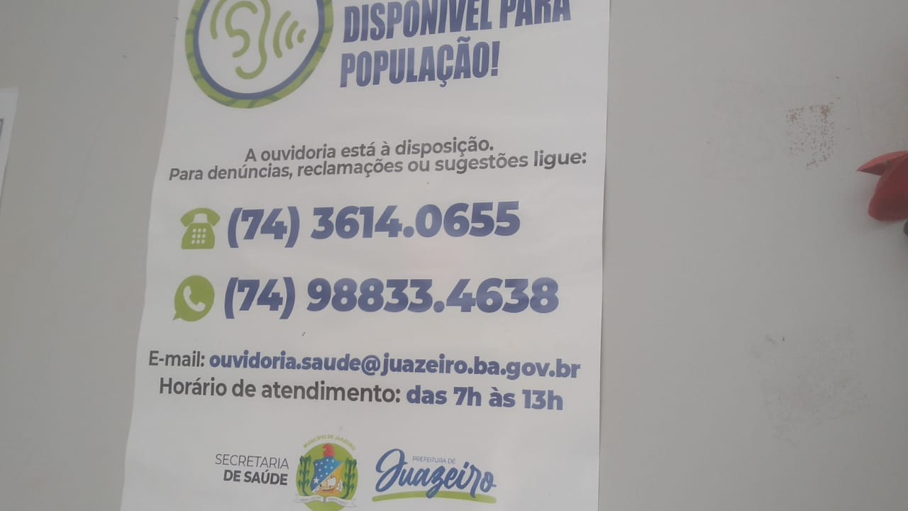 “Para manter o contato com a Ouvidoria da Sesau, a população pode entrar em contato pelo número 74 3614 0655 por ligação ou WhatsApp, pelo e-mail ouvidoria.saude@juazeiro.ba.gov.br ou ir diretamente na Ouvidoria que fica no prédio do Shopping Águas Center, na Avenida Adolfo Viana, bairro Maria Goreth. A Ouvidoria funciona das 7h às 13h”, informou a Sesau.