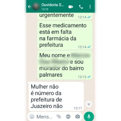 “Vi o contato em um cartaz que está na UBS do meu bairro e entrei em contato para reclamar sobre uma medicação que está em falta nas farmácias da rede pública. Queria saber também, quando a medicação vai chegar. Mas, para minha surpresa, o número é de uma pessoa particular, que não tem nada haver com a Sesau. Nós, usuários, também somos prejudicados com essa situação, pois ficamos sem saber qual realmente o contato para buscarmos informações”, criticou.