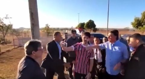 No entanto, membros da segurança do presidente o afastam e pedem para que não filmem o momento. “Filma, não”.