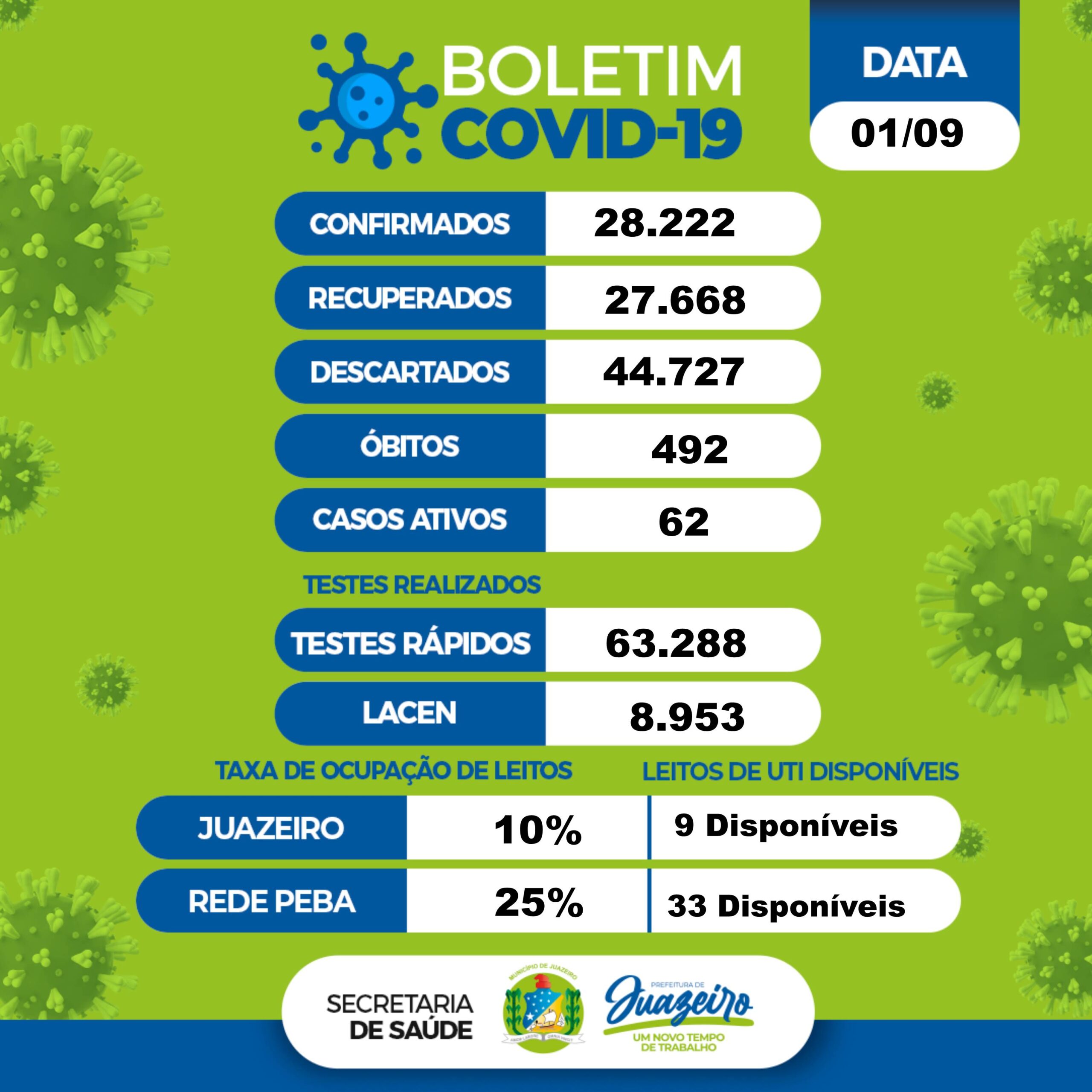 Juazeiro registrou dois novos casos da Covid-19. A informação está no boletim epidemiológico da Secretaria Municipal de Saúde (Sesau) desta quinta-feira (1º). O município não registrou óbito por complicações da doença e permanece com 492 mortes por Covid-19.