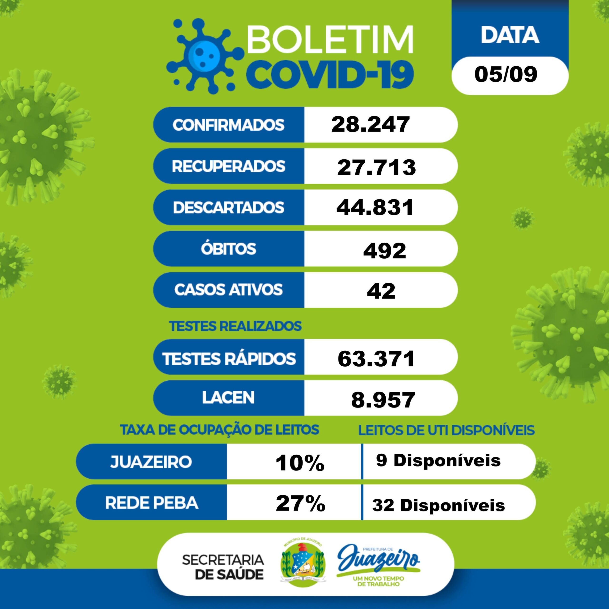 De acordo com o levantamento, 28.247 moradores foram infectados desde o início da pandemia na cidade, dos quais 27.713 já estão recuperados. Os casos descartados somam 44.831. Juazeiro tem 42 casos ativos do novo coronavírus.