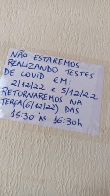 “Desde a semana passada que vou um local e noutro, sem conseguir fazer o teste. Fui no Centro de Saúde do Angari, nada. Lá não tinha material para a coleta e nem a técnica. Fui na UBS da Vila Jacaré e um aviso dizia que só a partir de terça, 6, e ainda assim somente das 15h30 às 16h30, ou seja só uma hora. Levei minha filha para vacinar no Centro de Saúde e só eram 40 doses e já tinham acabado por volta das dez e meia da manhã. Voltou pra casa sem vacinar”, contou.