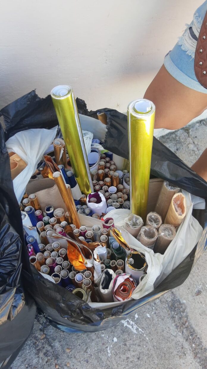 “Ainda bem que passei antes do caminhão de coleta, pois senão tudo viraria lixo. Vou doar pra a escola do município que minha sobrinha trabalha que chega material pra lá , mas não com essa variedade de cores e nem esses tipos de papel.