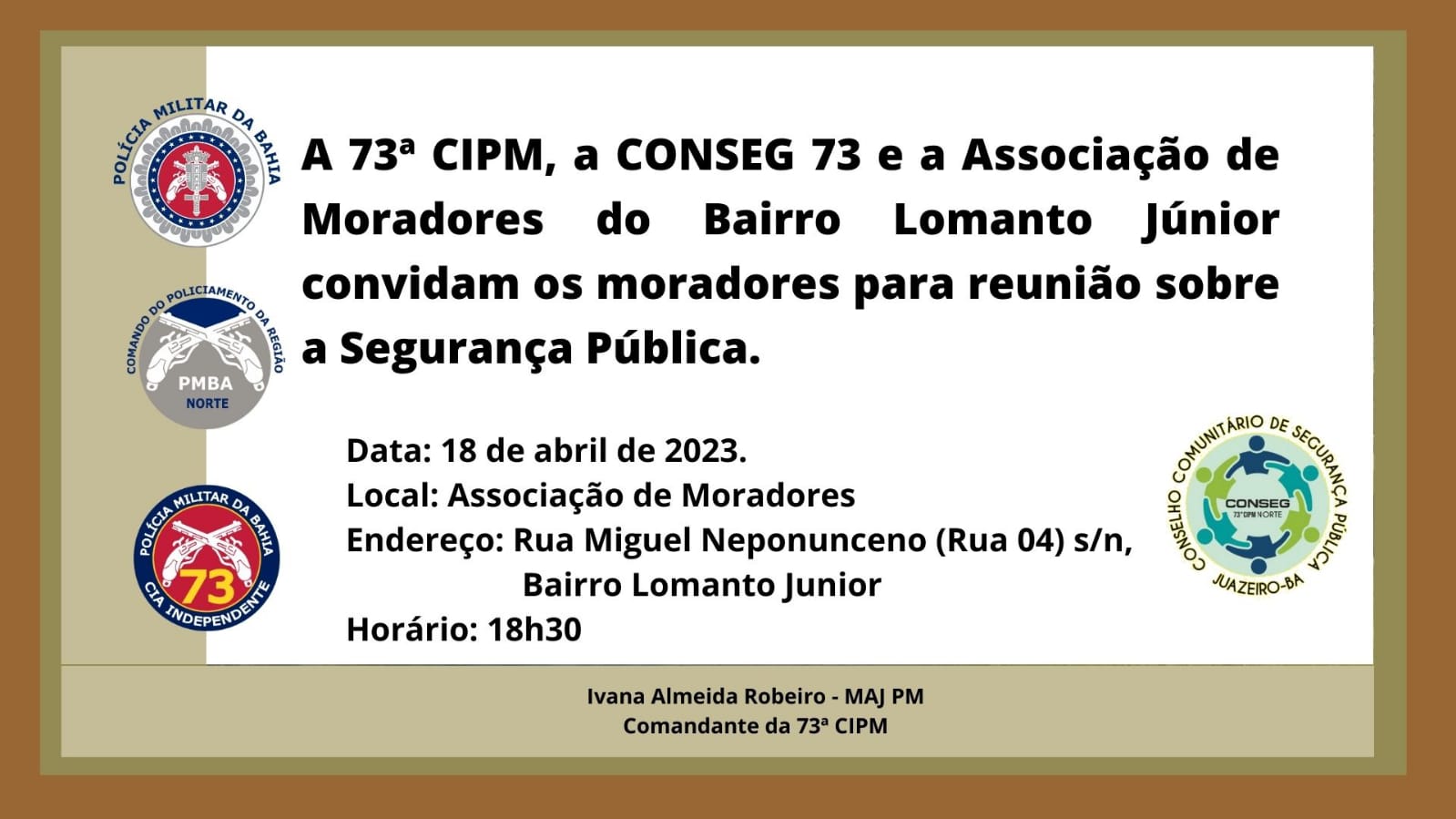 às 18h30, no Centro Comunitário do bairro, uma reunião para discutir segurança pública. A reunião contará com a presença da Major Ivana, Comandante da 73ª CIPM e do CONSEG/NORTE 73 CIPM.
