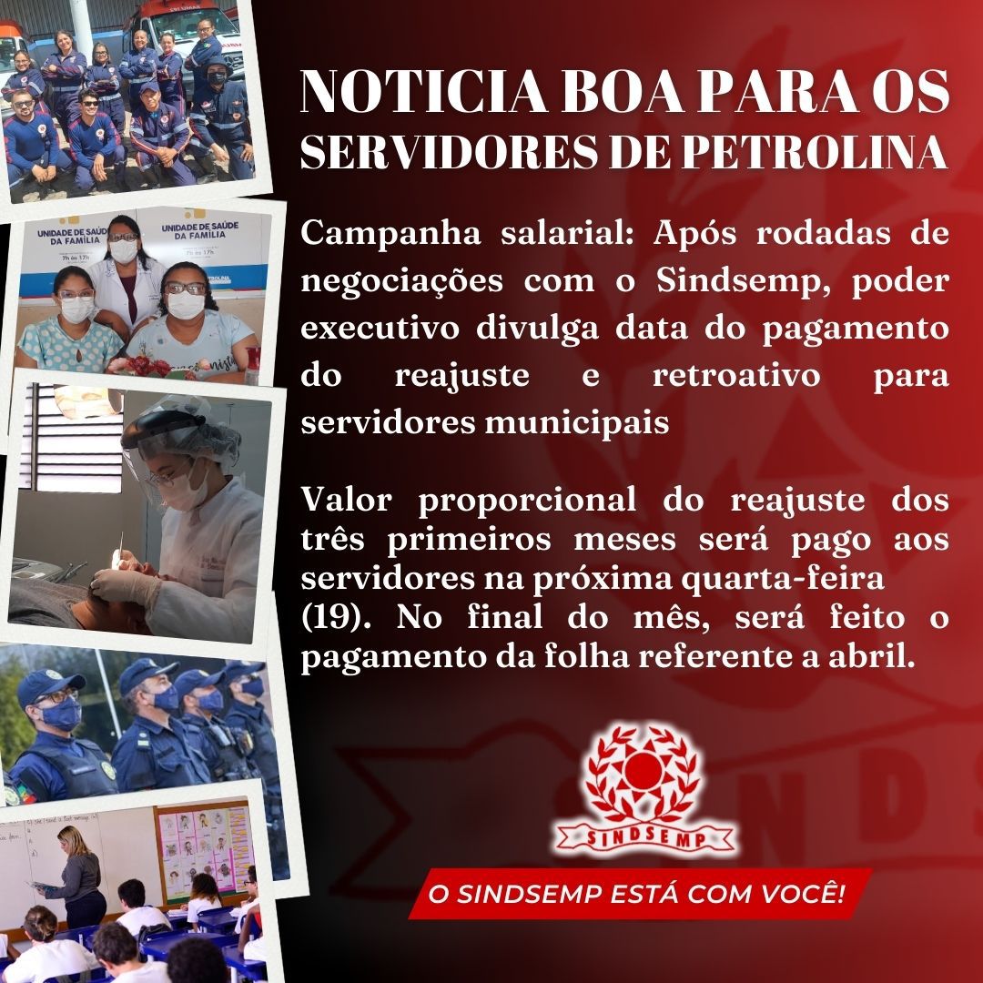 Após algumas rodadas de negociações com o Sindicato dos Servidores Públicos Municipais de Petrolina (Sindsemp), o poder executivo autorizou o reajuste salarial e o pagamento retroativo para os servidores municipais. A medida foi estabelecida por meio da Lei N° 010/2023, aprovada pela Câmara de Vereadores de Petrolina, na última terça-feira (11). Após aprovada e sancionada pelo o prefeito Simão Durando, a gestão municipal divulgou as datas dos pagamentos referentes aos reajustes e retroativos.De acordo com o prefeito de Petrolina, Simão Durando, o valor proporcional do reajuste dos três primeiros meses será pago aos servidores na próxima quarta-feira (19). No final do mês, será feito o pagamento da folha referente a abril.O Sindsemp destaca o compromisso e a luta pelos direitos do servidor e reforça que esse é um grande avanço, mas a campanha salarial ainda segue com negociações para garantir mais conquistas para as categorias. ENTENDA O REAJUSTE DAS CATEGORIASOs servidores públicos municipais com cargos e remuneração regidos por Leis específicas tiveram reajuste de 6%, em conformidade com o valor salarial de cada categoria. O reajuste de 7,50% se refere aos profissionais de nível elementar, totalizando vencimento básico mensal de R$ 1.306,75; profissionais de nível médio, totalizando vencimento básico mensal de R$ 1.312,06 e profissionais de nível superior, totalizando vencimento básico de R$ 1.444,50.Também estão incluídos os reajustes dos vencimentos básicos dos profissionais efetivos da carreira do magistério, com reajustes em escalonamento progressivo, da seguinte forma: Janeiro a junho: 8%Julho a setembro: 10%A partir de outubro: 14,95%O piso salarial municipal dos Agentes Comunitários de Saúde (ACS) e dos Agentes de Combate à Endemias (ACE), agora passam a ser fixados em R$ 2.640, a partir do reajuste do salário mínimo, no valor de R$ 1.320. As estabilidades financeiras também ficam reajustadas em 6,0%. Os valores refletem em ganho real em relação à inflação do período em seus vencimentos e a medida tem efeito retroativo a janeiro deste ano.