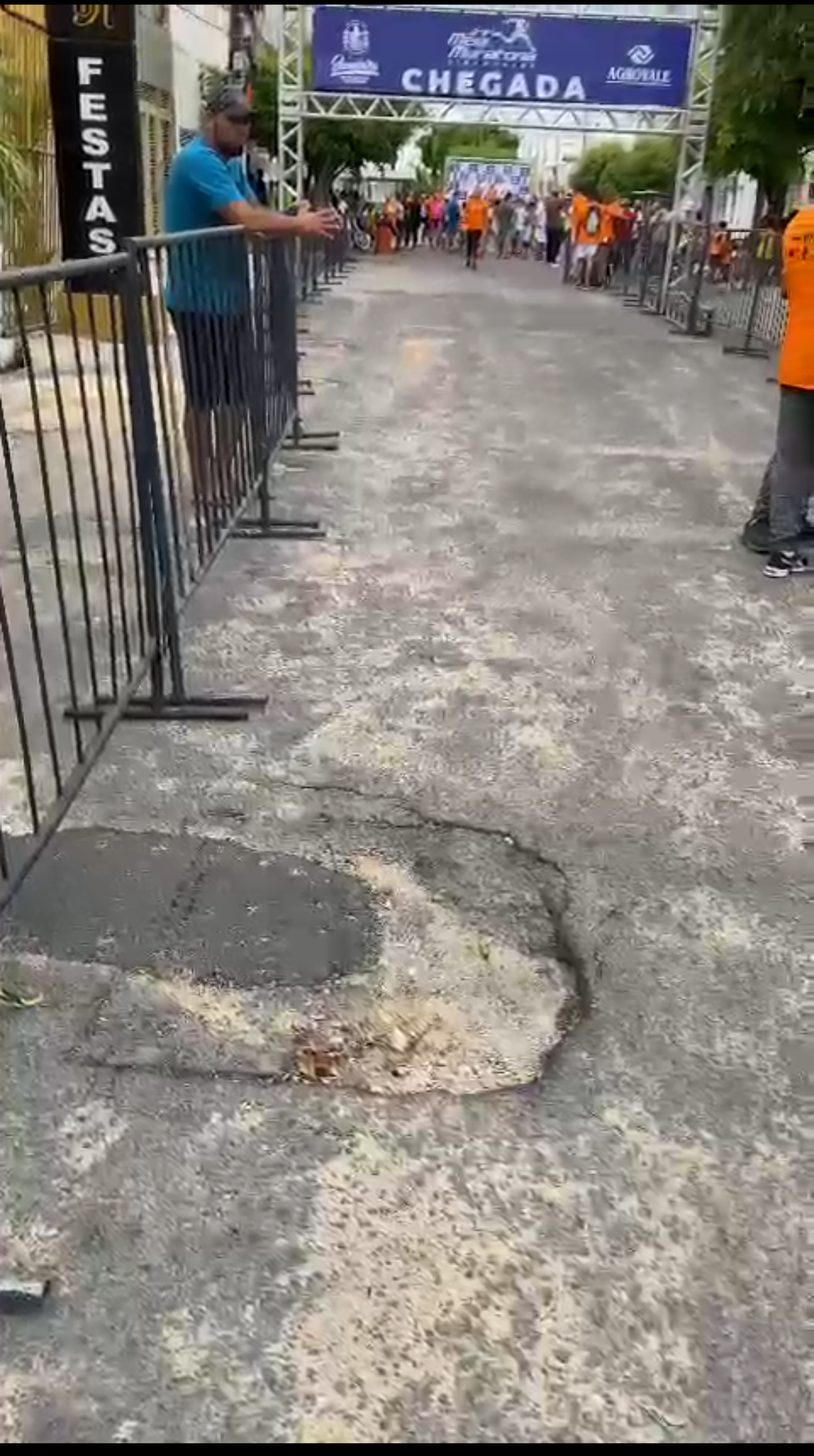 “Estou aqui com minha filha para correr a tradicional Corrida da Tiradentinhos, mas infelizmente olha o buraco que está na rua Tiradentes justamente na chegada da corrida. Está colocando em risco todas as crianças que vão participar”, criticou.