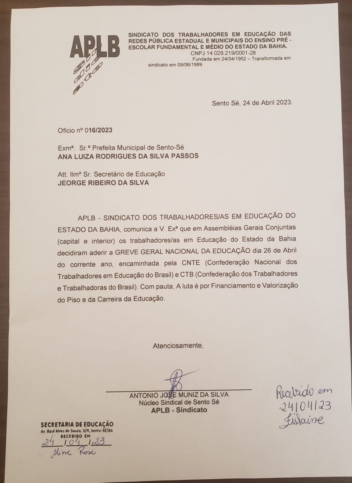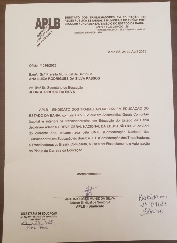 Os profissionais da Educação de Sento Sé irão paralisar as atividades nesta quarta-feira (26) no município para cobrar valorização do Piso do Magistério e da Carreira da Educação. O Sindicato dos Trabalhadores em Educação (APLB), já comunicou a secretaria de Educação e a gestão municipal sobre a greve.