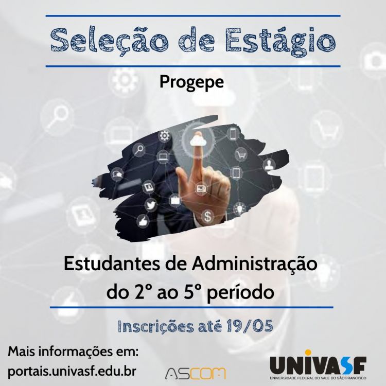 Para realizar o preenchimento de uma vaga, a Pró-Reitoria de Gestão de Pessoas (Progepe) da Universidade Federal do Vale do São Francisco (Univasf) abriu processo seletivo para estágio remunerado. Estão aptos para participar estudantes do curso de Administração de qualquer Instituição de Ensino Superior (IES) pública ou privada e que estejam cursando do 2º ao 5º período com frequência regular. Os candidatos podem realizar suas inscrições até o dia 19 de maio.