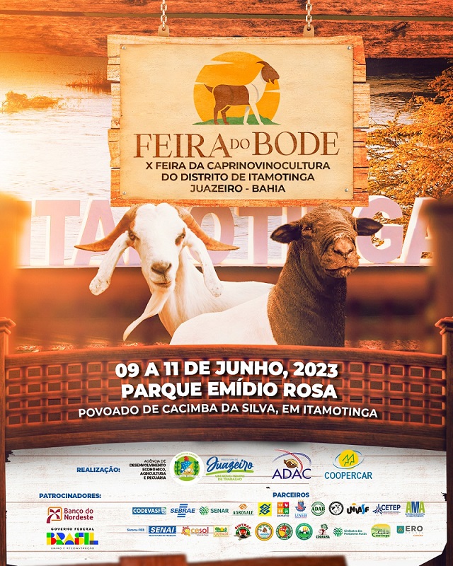 Começa nesta sexta-feira (9) a 10ª Feira do Bode de Itamotinga, uma realização da Prefeitura de Juazeiro, através da Agência de Desenvolvimento Econômico, Agricultura e Pecuária (Adeap), em parceria com a Associação de Desenvolvimento e Ação Comunitária (Adac), Comissão Organizadora do Distrito de Itamotinga, e o patrocínio do Banco do Nordeste e Governo Federal.