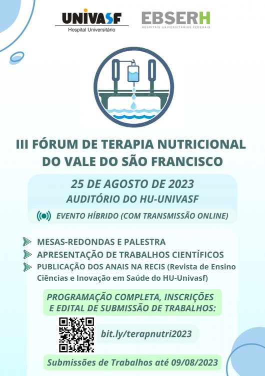 Com o objetivo de promover a qualificação e atualização científica na área de terapia nutricional para os profissionais de saúde de toda a região, membros do Comitê Multidisciplinar em Terapia Nutricional e nutricionistas do Hospital Universitário da Univasf (HU-Univasf/Ebserh) realizarão o III Fórum de Terapia Nutricional do Vale do São Francisco, no dia 25 de agosto, em formato híbrido e gratuito.