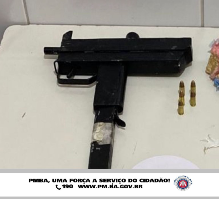 Ele foi preso durante patrulhamento da PM nas proximidades da rua dois, bairro Itaberaba, em Juazeiro-BA.O acusado tentou fugir ao avistar as guarnições, mas foi alcançado e com ele foram apreendidos uma submetralhadora “macaquinha” cal. 9 mm; cinco munições calibre cal. 9 mm; 1 kg aproximadamente, de uma substância análoga ao crack;1,5kg, aproximadamente, de uma substância análoga à cocaína; 200 gramas, aproximadamente, de substância análoga à maconha e uma quantia de dinheiro, em espécie.“Após consulta nos Sistemas de Pesquisa, verificou-se que o conduzido tem passagem por tráfico de drogas nos municípios de Juazeiro e Senhor do Bonfim”, informou a PM.O suspeito e todo o material apreendido foram encaminhados à Delegacia da Polícia Civil de Juazeiro, para adoção das medidas cabíveis junto ao judiciário.Redação PNB, com informações Ascom/ CIPT – Norte (RONDESP)
