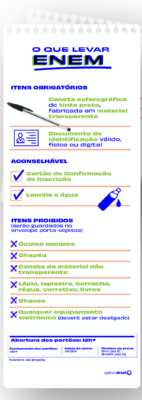 É obrigatório levar caneta esferográfica de tinta preta, fabricada em material transparente, e documento de identificação válido, físico ou digital. Também é aconselhável levar o cartão de confirmação de inscrição. Se o candidato precisar justificar sua presença no exame, ele deve levar impressa a declaração de comparecimento, que será assinada pelo aplicador do exame. A declaração está disponível na Página do Participante.