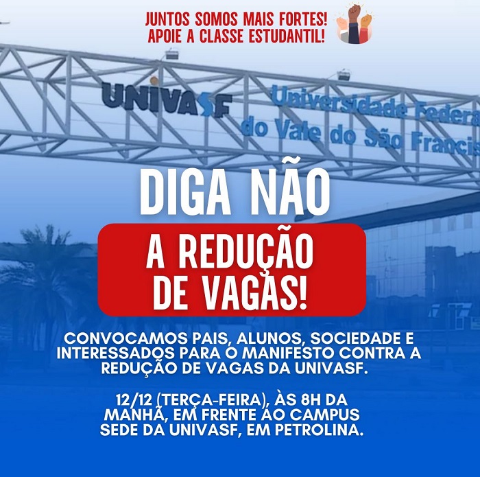 Uma representação de pais e alunos do Vale do São Francisco enviaram ao PNB uma convocação para uma manifestação marcada para a próxima terça-feira (12), às 8 horas, em frente a Univasf- Campus Petrolina, contra “a redução de vagas na instituição.”