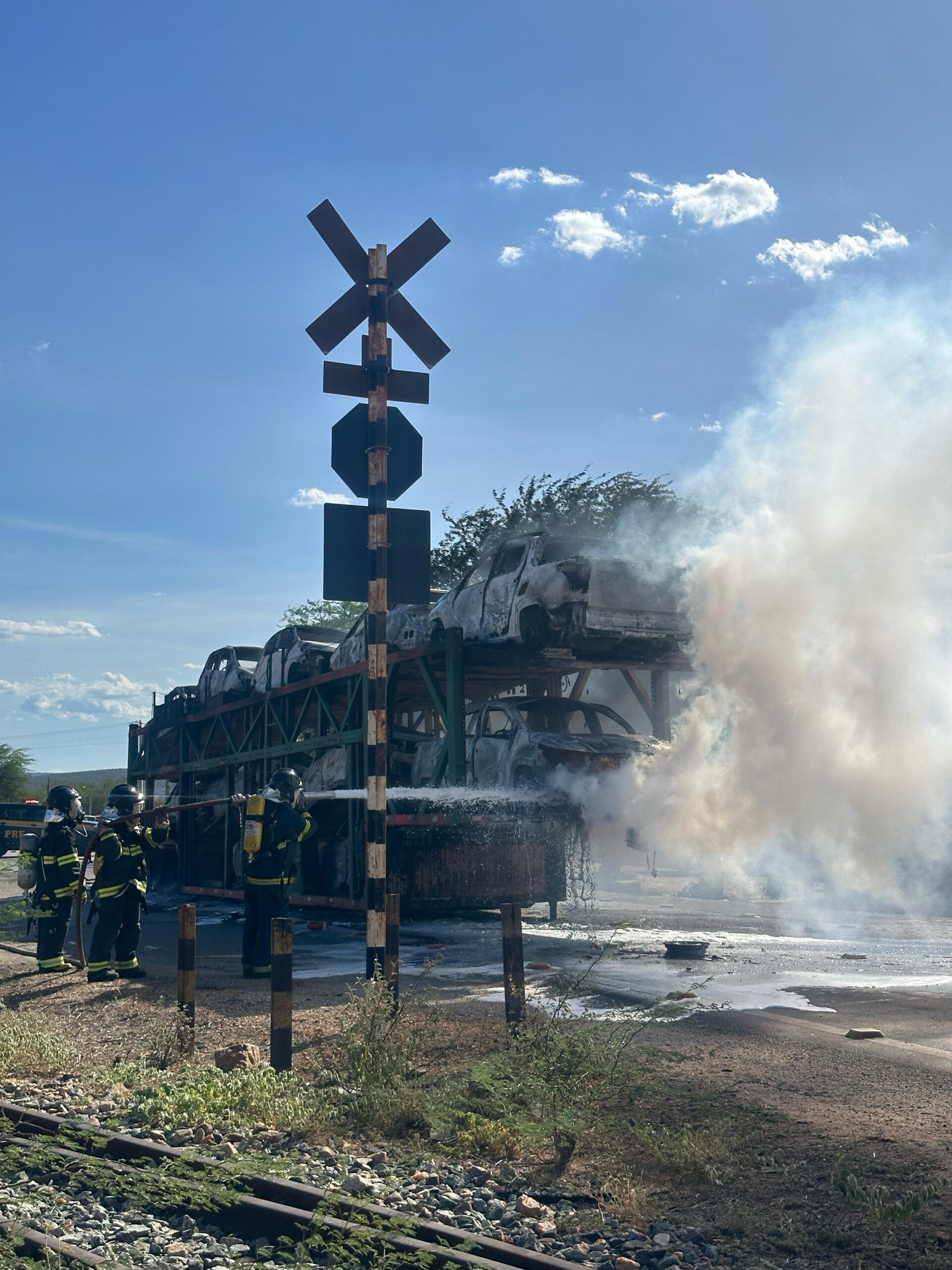 Na tarde desta quarta-feira (27), uma carreta tipo cegonha, que transportava vários veículos menores, pegou fogo na BR-407, no povoado de Flamengo, em Jaguarari.