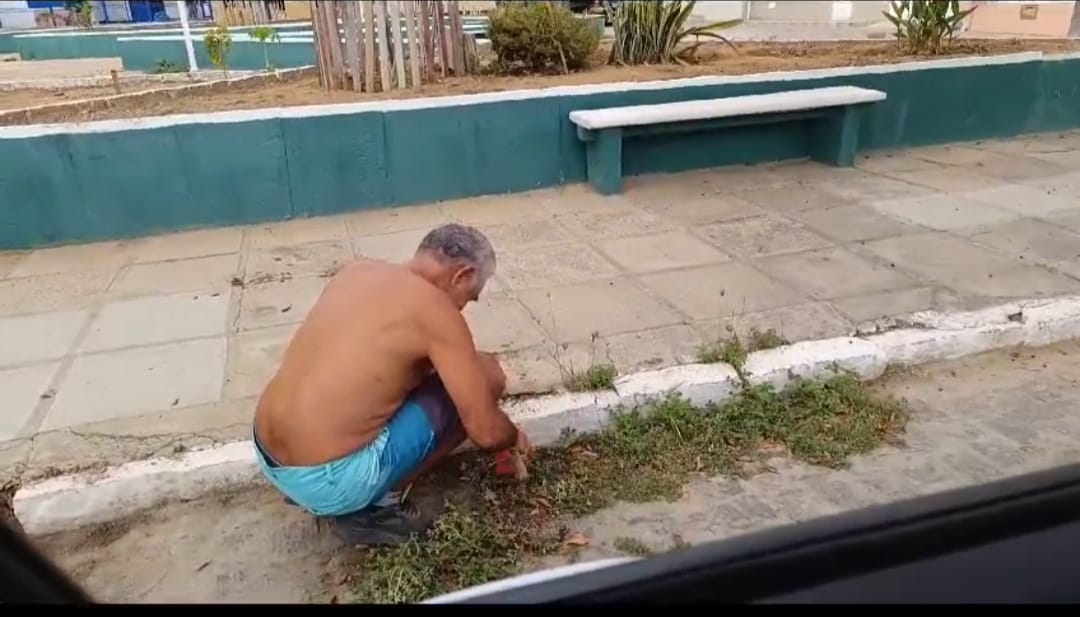Em outro vídeo enviado ao PNB, um morador flagra um vizinho de 75 anos, retirando o mato do meio fio da praça.