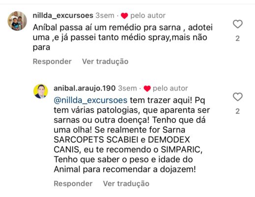 Ele enviou um print em que o edil responde a uma seguidora que pede para ele “passar um remédio pra sarna”. Aníbal cita alguns medicamentos e pede que a seguidora leve o animal até a clínica pra ele “saber o peso e a idade para recomendar o Dojazem.”