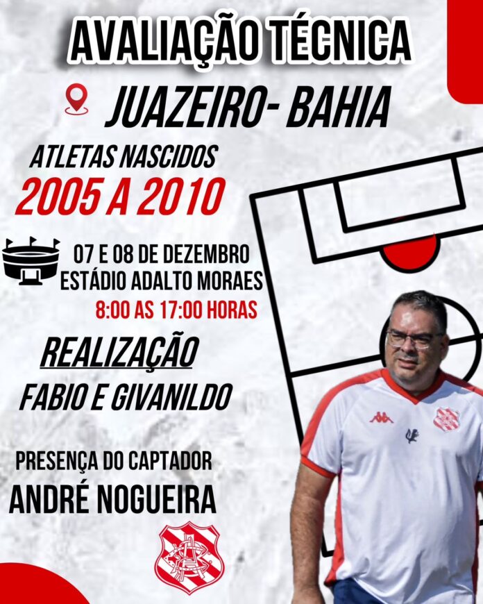 Neste final de semana, o estádio Adauto Morais, em Juazeiro, recebe a avaliação técnica para atletas nascidos em 2005 a 2010, que sonham em se tornar jogadores de futebol profissional. A seletiva inicia a partir das 08h, neste sábado (07) e domingo (08).