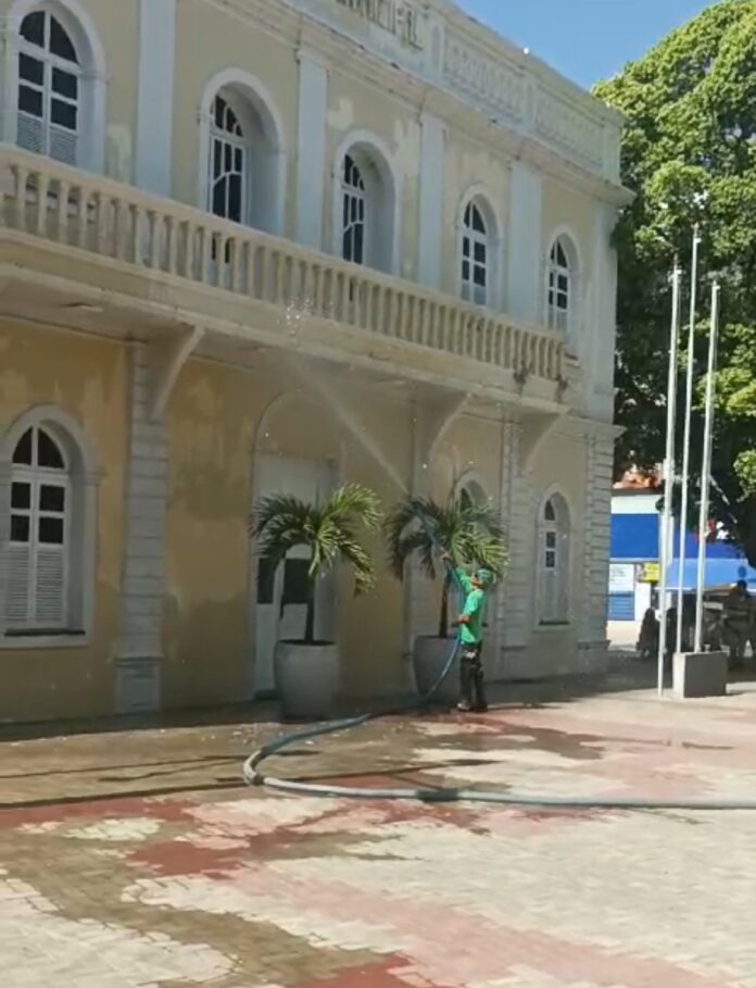 Um vídeo enviado ao Portal Preto no Branco por um leitor mostra a fachada do Paço Municipal de Juazeiro, na região Norte da Bahia, sendo lavada na manhã desta quinta-feira (02). Com o auxílio de um carro pipa, um profissional faz o trabalho de limpeza do prédio.