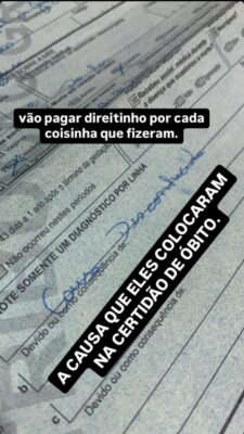 “Que descaso é esse que nem a própria mãe tem o direito de saber o porquê de sua filha ter nascido morta? Só soube o que realmente aconteceu porque uma enfermeira me disse que ela tinha engolido o cocô que fez na minha barriga. Quando a bolsa estourou e saiu um líquido escuro, eu cheguei a informar a uma enfermeira, mas ela disse que era urina. Chegaram a falar em má formação e até a dizer que minha filha tinha uma doença rara no coração, o que não é verdade. Minha filha era perfeita. Nem mesmo o direito de pegar ela nos braços eu tive, pois eles botaram remédio no soro para me dopar, sem a minha permissão”.