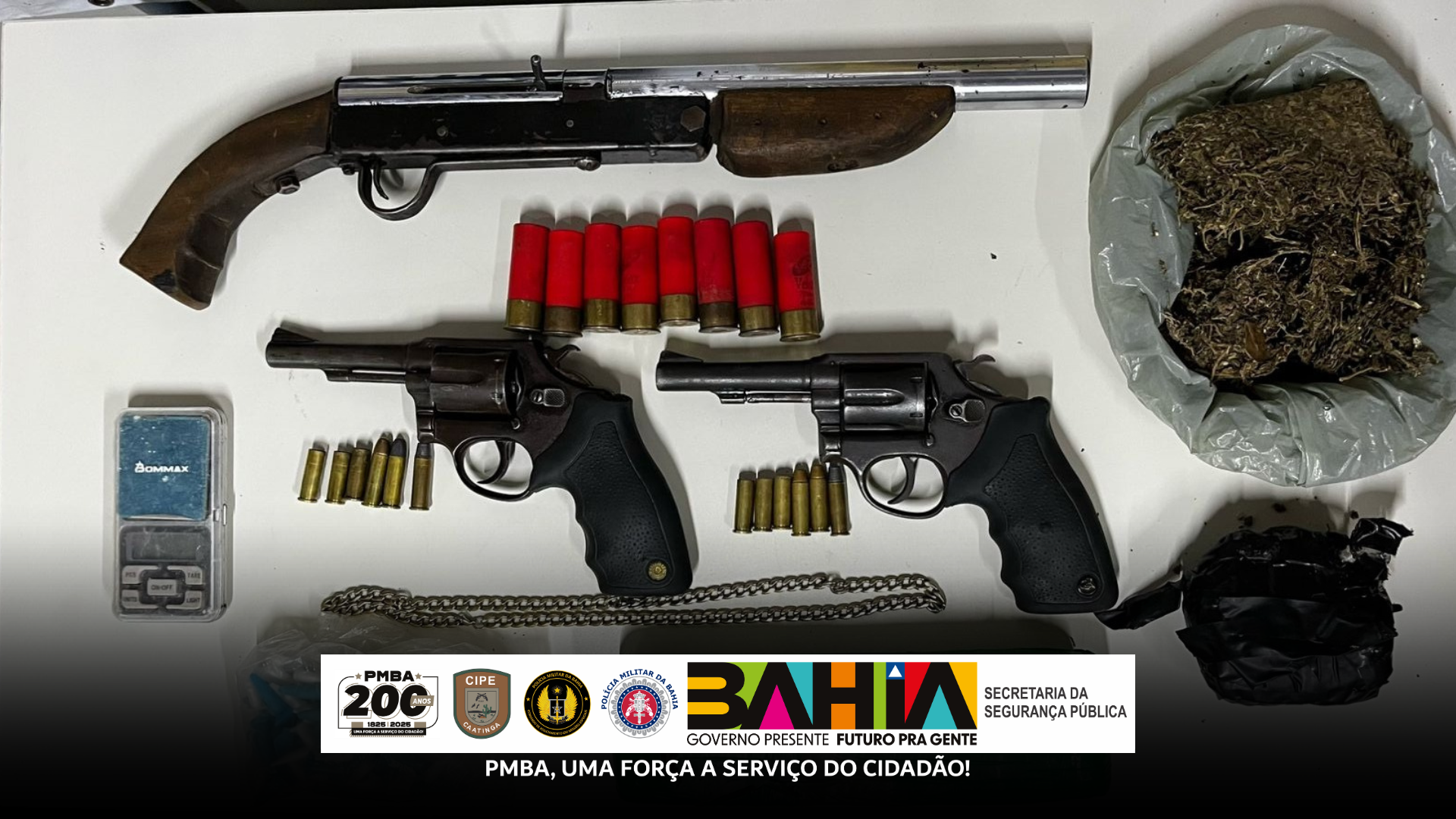 A PM informou que foram apreendidos: 01(um) revólver, cal .38, numeração 795598, 02 (duas) munições cal .38 intactas, uma pinada e três estojos deflagrados, 01 (um) revólver, cal 38, numeração 1451806, 01 (uma) munição intacta, 02 pinadas e 03 estojos deflagrados, 01 (uma) escopeta artesanal cal 12, 08 (oito) cartuchos intactos cal 12, 02 (duas) embalagem plástica contendo erva seca análoga maconha, 01 (um) tablete de erva seca prensada análoga a maconha, 90 (noventa) pinos contendo substância análoga a cocaína, 01 (uma) corrente dourada, 01 (uma) bolsa cinza.