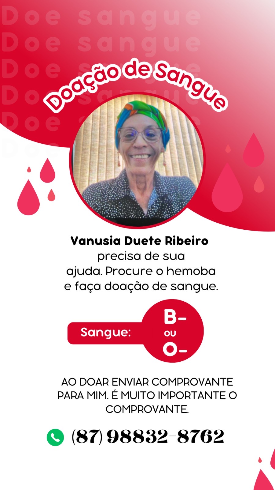 Familiares de Vanusia Duete Ribeiro, de 67 anos, entraram em contato com o Portal Preto no Branco para pedir doação de sangue. Conforme o relato, Vanusia está internada no Hospital Regional de Juazeiro com câncer no colo do útero e precisa de sangue tipo O negativo ou B negativo.