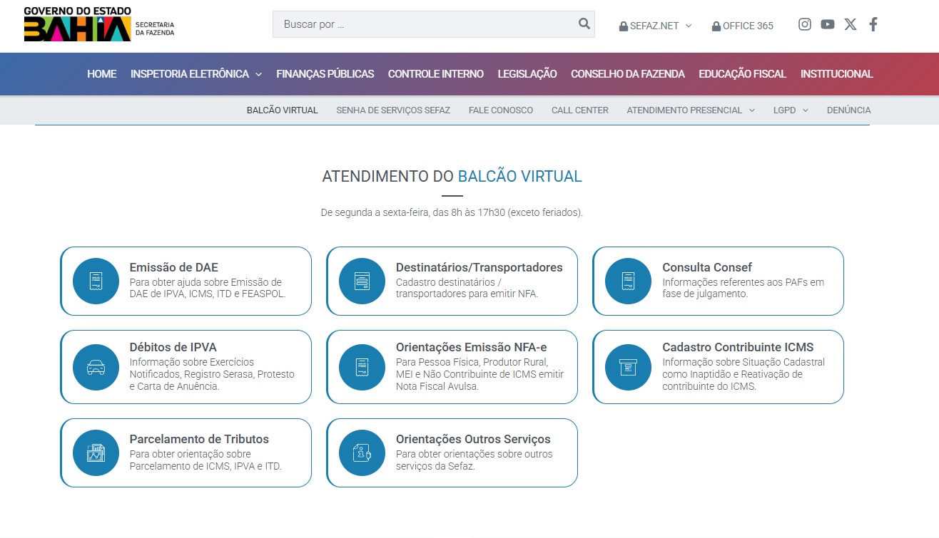 No Balcão Virtual os contribuintes encontram um espaço seguro e eficiente para tirar suas dúvidas e efetuar procedimentos sem sair do conforto de casa. No site, é possível encontrar os serviços de emissão de DAE, débito de IPVA, parcelamento de tributos, cadastro de destinatários/transportadores, orientação sobre emissão da NFA-e, consulta ao Consef, cadastro de contribuintes do ICMS e orientações sobre outros serviços. A plataforma também conta com canais exclusivos para atendimento sobre o ITD (Imposto sobre Transmissão “Causa Mortis” e Doação de quaisquer Bens ou Direitos), e ainda o Plantão Fiscal da Sefaz-Ba. Esse último funciona exclusivamente de segunda a sexta, das 8h às 12h.