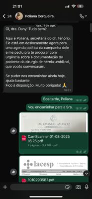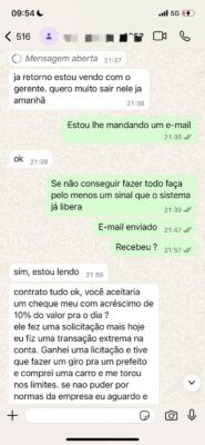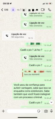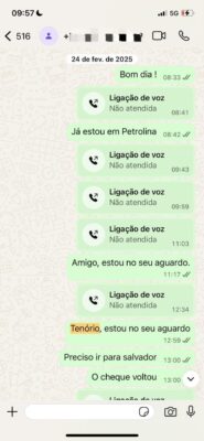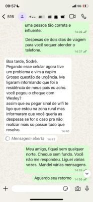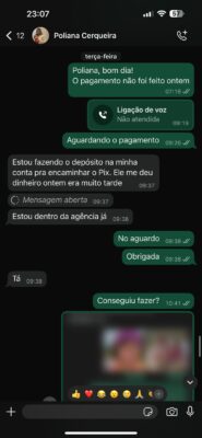 “Sou nutricionista formada há 15 anos. Ele me ofereceu um trabalho no Núcleo Regional de Saúde-Norte, antiga DIRES. Inclusive, ele me disse que o pai dele era diretor de lá e que tinha cotas de indicações através de um deputado estadual. Ele pediu os meus documentos e disse que essa Poliana ia entrar em contato comigo. Ela entrou em contato e eu não quis mandar meus documentos por WhatsApp. Ela me informou o e-mail e eu enviei meus documentos. Foi nesse momento que ela falou que eu teria que pagar os exames admissionais no valor de 400 reais. Foi aí que eu entendi que teria algo errado. Eu falei para ele que isso estava estranho, porque em todos os trabalhos que eu já tive, quem arcou com os custos do admissional foi quem estava me contratando. Ele desconversou, alegou que a junta de saúde era complicada, deu várias desculpas e disse que eu não precisava mandar o dinheiro. Eu acredito que ele disse isso porque percebeu a minha desconfiança. Porém, esse contrato de emprego nunca chegou e eu realmente entendi que era um golpe. Eu não cheguei a perder dinheiro, mas fui enganada, fui ludibriada por um emprego que nunca existiria. O medo agora é de ele usar os meus documentos para fins ilícitos”, declarou.