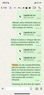 Em contato com o Portal Preto no Branco, o dono de uma empresa com sede em Salvador, denunciou que Manoel Tenório realizou uma compra no valor de R$ 37 mil utilizando um cheque sem fundo.