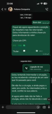 “Ele chegou até mim por uma postagem no Instagram, onde eu falava que estava no hospital, e ele perguntou se eu estava precisando de algo. Eu expliquei que estava com uma pessoa precisando fazer uma cirurgia de hérnia umbilical e ele se ofereceu para ajudar a marcar a cirurgia ou em um hospital particular ou no Hospital Regional. Eu perguntei se ele conseguiria no hospital particular e ele me pediu os exames que o paciente já tinha feito para autorizar o procedimento. Depois, ele me passou o contato de uma mulher de nome Poliana Cerqueira, dizendo que ela entraria em contato comigo. Eles me disseram que haviam conseguido agendar a cirurgia para o dia 5 de agosto, às 18h, pelo valor de R$ 800,00. Eu fiz a transferência para o Pix que me enviaram. Posteriormente, me disseram que eu teria que enviar mais R$ 550,00 para pagar a taxa de agendamento cirúrgico. Fiz o pagamento e aguardei a data dessa cirurgia. No dia marcado para o procedimento, eles entram em contato informando que não tinha como ser feito, porque o médico teve que fazer outra cirurgia de urgência de uma pessoa idosa e que iria marcar uma nova data para a cirurgia. Porém, essa outra data nunca apareceu e ele nunca devolveu o valor repassado. Fomos informados que ele está fazendo isso com outras pessoas também. Quando ele vê que alguém está precisando de alguma coisa ele chega e se oferece para ajudar. Ele diz que tem amizade com deputado, com prefeito, governador e pessoas influentes. Ele falou que tinha parceria com o dono do hospital e que a gente só ia arcar com o pagamento do anestesista e da marcação, que era diretamente para o médico, porque a cirurgia não tinha como ser feita pelo SUS. Até hoje aguardamos a devolução do pagamento. Teve um dia que a gente cobrou bastante e eles falaram que iam fazer o depósito. Chegaram a falsificar o comprovante de depósito, disseram que estavam no banco e, inclusive, a Poliana mandou foto. Porém, fizeram um depósito falso e esse depósito nunca entrou na conta”, contou uma vítima.