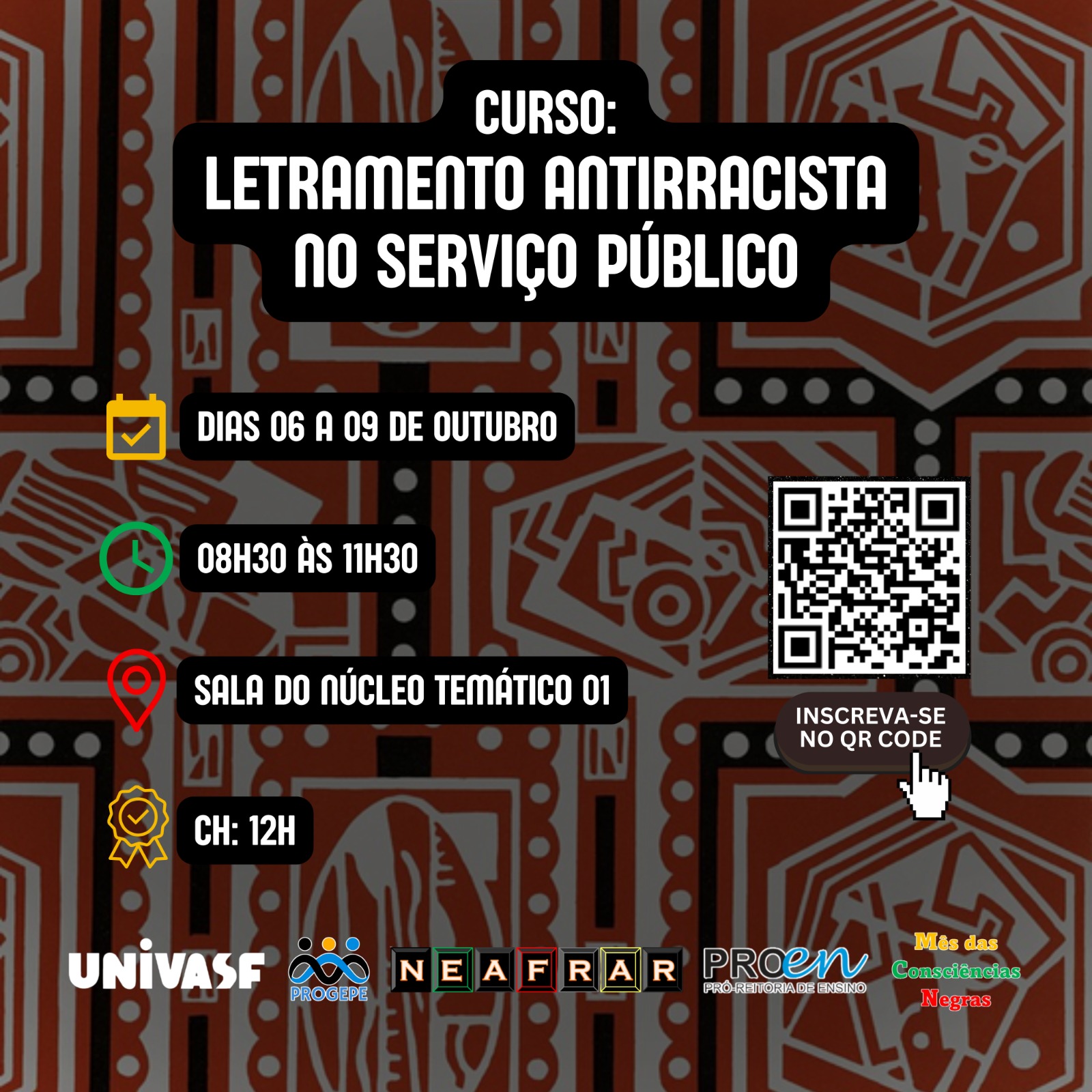 A Pró-Reitoria de Gestão de Pessoas da Univasf, por meio da Coordenação de Capacitação e Desempenho, em parceria com o Núcleo de Estudos Étnicos e Afro-Brasileiros Raoni Metuktire-Abdias Nascimento-Ruth de Souza (NEAFRAR) e com a Pró-Reitoria de Ensino (PROEN), informa que estão abertas, até o dia 03 de outubro, as inscrições para o Letramento Antirracista no Serviço Público.