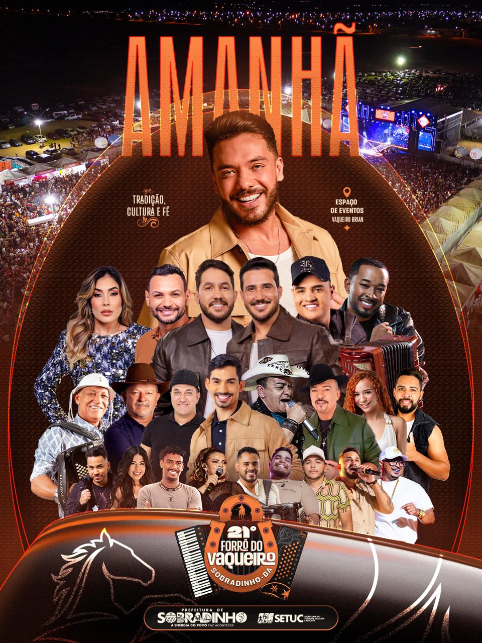 Na grade de atrações estão: Wesley Safadão, Tarcísio do Acordeom, Iguinho e Lulinha, Túlio Duarte, Toque 10, Toca do Vale, Desejo de Menina e Brega e Vinho, além de artistas locais e regionais que provam o talento e a vocação cultural de Sobradinho.