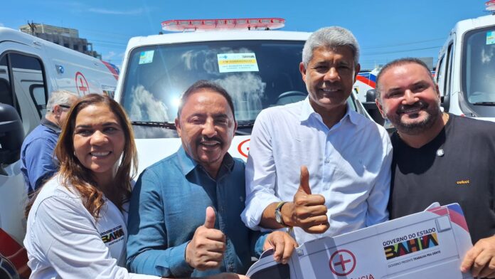 O deputado Roberto Carlosesteve na União dos Municípios da Bahia, em Salvador, ao lado do governador Jerônimo Rodrigues e do prefeito de Sobradinho, Cleivynho Sampaio, para a entrega de uma ambulância de alta complexidade, fruto de emenda parlamentar de sua autoria, que vai reforçar o atendimento na rede municipal de saúde.