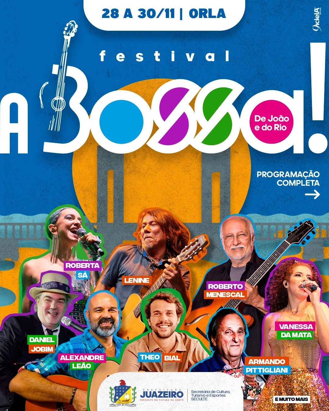 Durante os dias 28 e 30 de novembro, Juazeiro, na Bahia, recebe o festival ‘A Bossa!’. O evento conecta as águas do Rio São Francisco — berço artístico do músico João Gilberto — às ondas do Rio de Janeiro, onde ele transformou a história da música com a Bossa Nova. Com programação que inclui rodas de conversa e shows, o festival terá apresentações no Centro de Cultura João Gilberto e na Orla II da cidade. O evento é gratuito, promovido pela Prefeitura de Juazeiro, por meio da Secretaria de Cultura, Turismo e Esportes/Seculte.