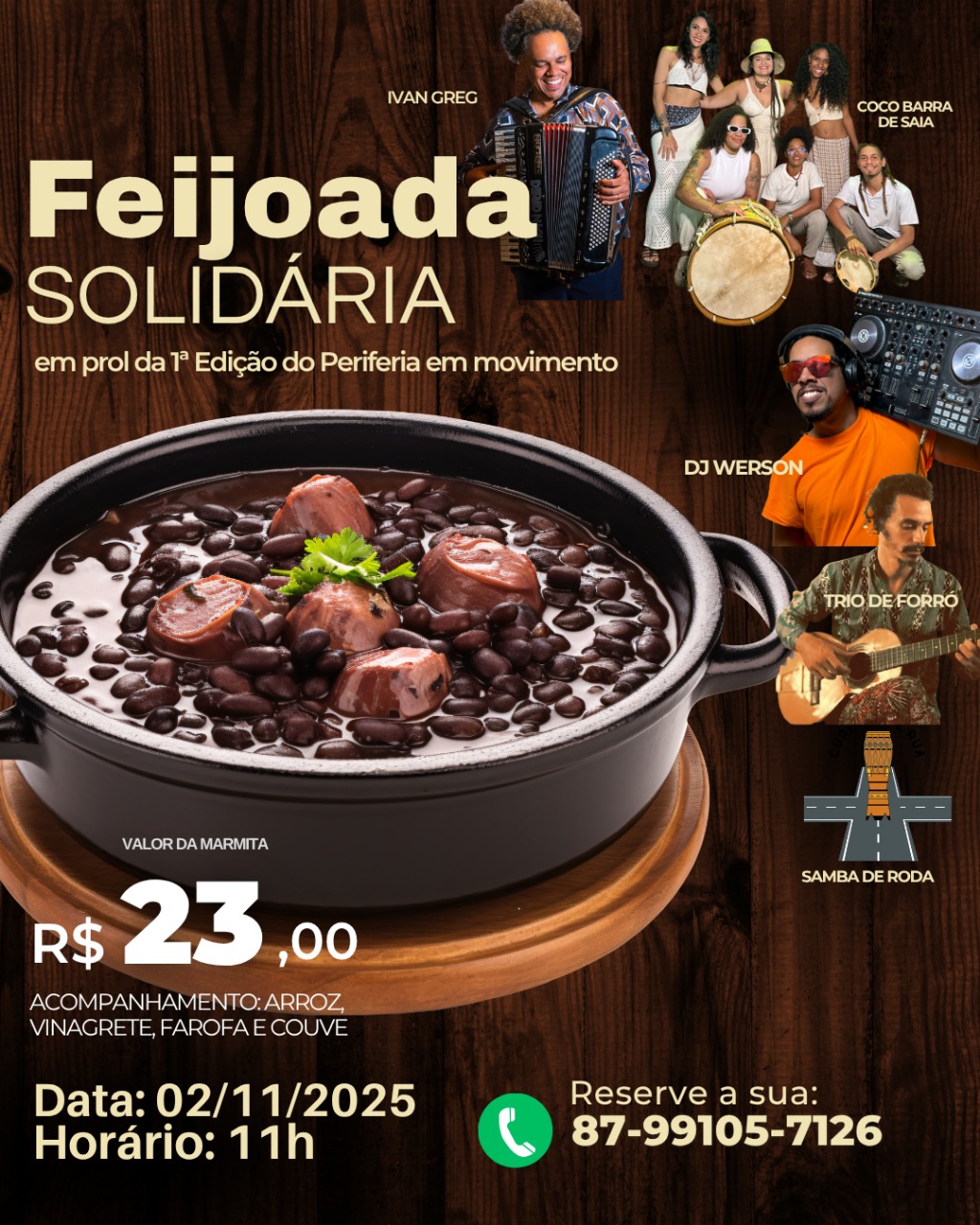 A feijoada é uma ação coletiva do Coletivo Kizomba Cultural, que acredita na cultura como força viva da comunidade. Toda a renda arrecadada será destinada à realização do Periferia em Movimento, que trará oficinas gratuitas, apresentações artísticas, rodas de conversa e vivências culturais durante todo o mês de novembro.