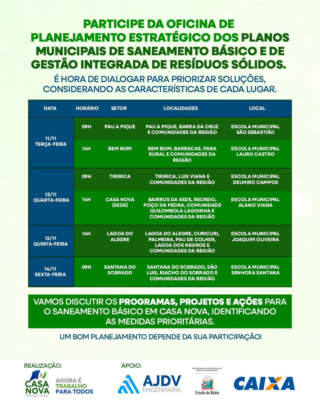 Entre os dias 11 e 14 de novembro, a Prefeitura de Casa Nova realizará oficinas de Planejamento Estratégico dos Planos Municipais de Saneamento Básico e de Gestão Integrada de Resíduos Sólidos. Os encontros acontecerão na sede e em diversas comunidades do interior, com o objetivo de ouvir a população e construir, de forma participativa, políticas públicas voltadas à melhoria do saneamento e da gestão dos resíduos no município.