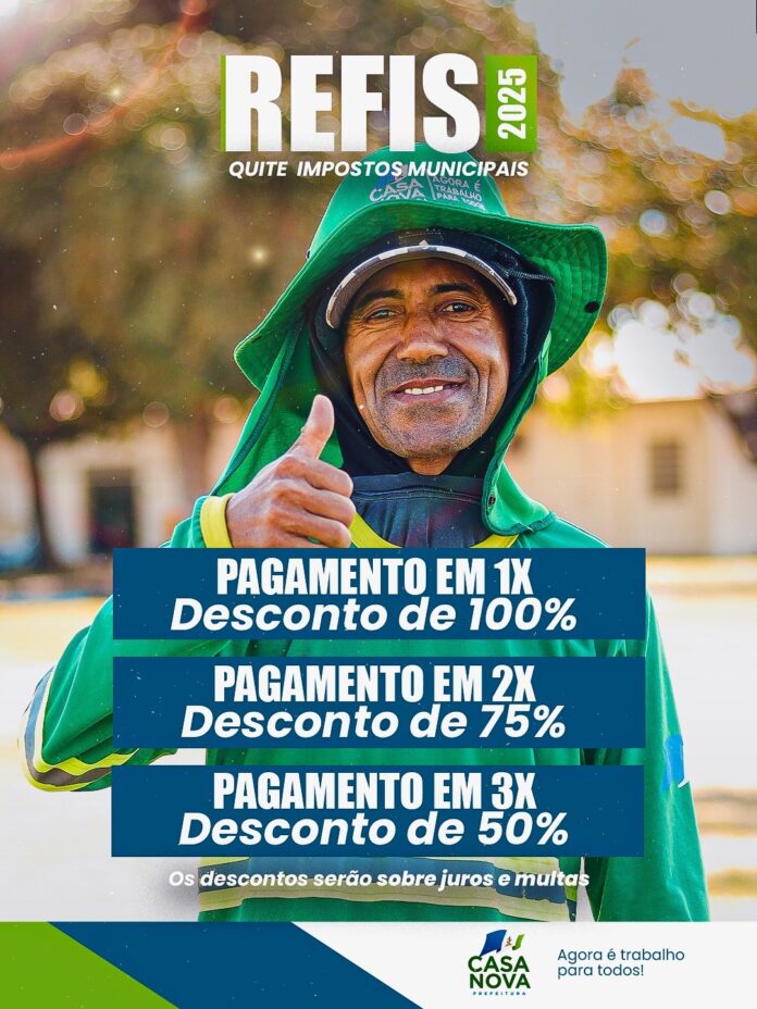 A Prefeitura de Casa Nova, por meio da Secretaria da Fazenda, está promovendo o Programa de Recuperação Fiscal (Refis) 2025, que oferece condições vantajosas para contribuintes regularizarem seus débitos com o município. A iniciativa contempla dívidas referentes ao IPTU e alvarás acumuladas nos últimos cinco anos, com abatimentos que podem chegar a 100% sobre juros e multas.