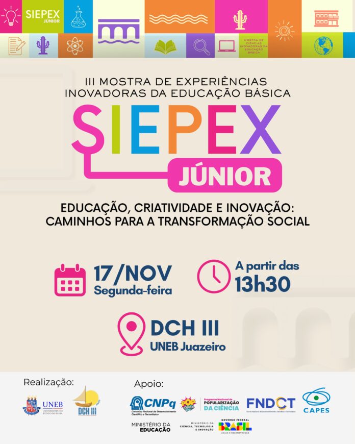 A 3ª SIEPEX Júnior – Mostra de Experiências Inovadoras da Educação Básica, com o tema: Educação, criatividade e inovação: caminhos para a transformação social será realizada na próxima segunda-feira (17), na Uneb, em Juazeiro. A Siepex Jr é promovido pelo Departamento de Ciências Humanas e vai premiar práticas criativas e projetos de ciência inspiradores das escolas da região.