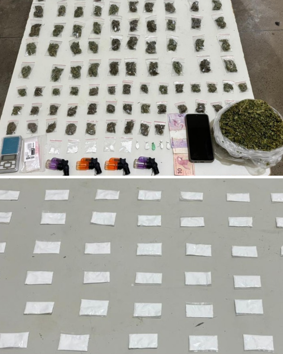 A primeira prisão ocorreu por volta das 11h, no Residencial Juazeiro 3. Segundo a PM, durante rondas, os policiais identificaram um homem utilizando entorpecente em um comércio da comunidade. Na abordagem, foram encontradas 87 porções de maconha, 10 porções de cocaína, uma embalagem com cerca de 1,5 kg de maconha, além de uma balança de precisão, um celular, câmeras e dinheiro em espécie.
